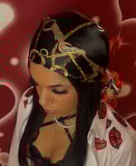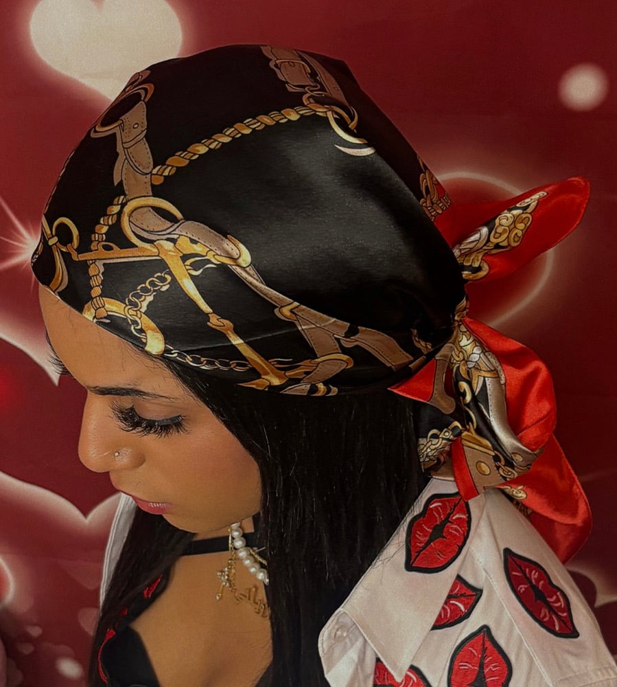 A black & red design silk head scarf that is luxurious, & a versatile accessory known for its soft, smooth texture, natural sheen, and breathability. It protects hair from frizz, tangles, and breakage while adding style or getting a style done