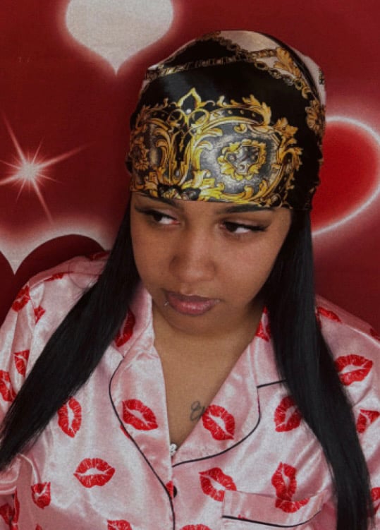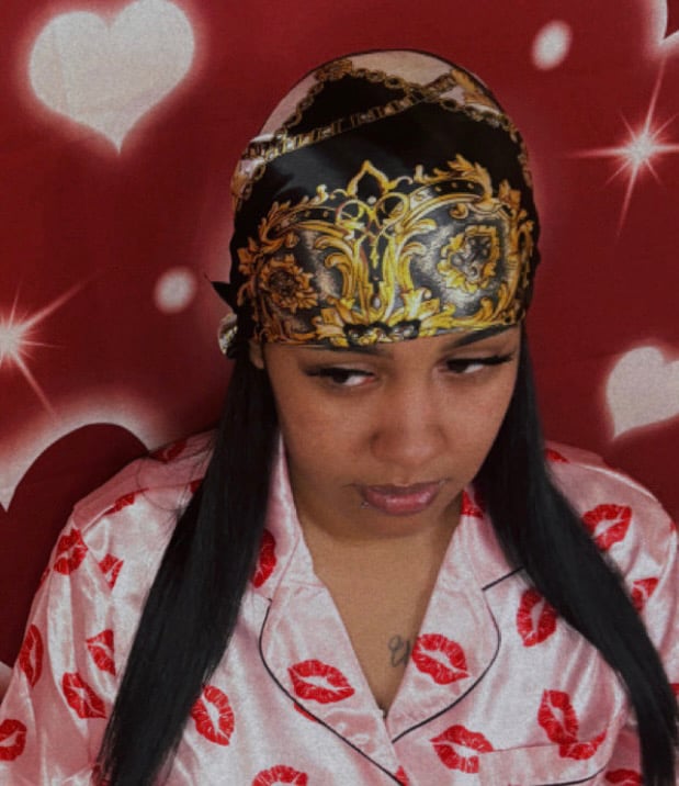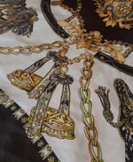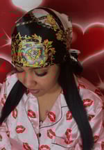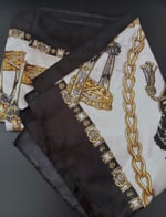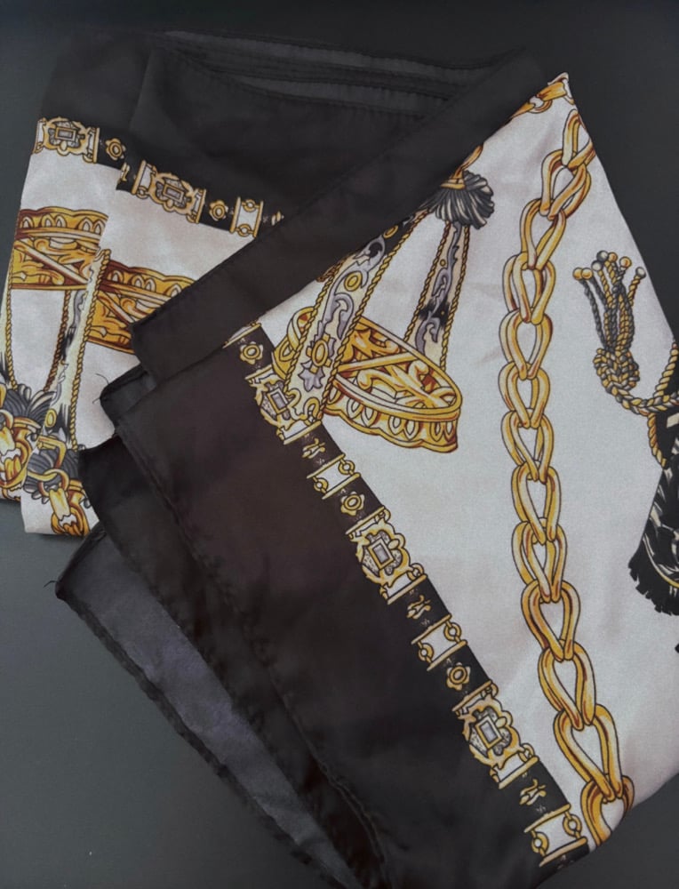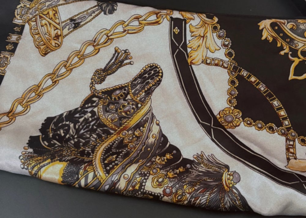 A black & white design silk head scarf that is luxurious, & a versatile accessory known for its soft, smooth texture, natural sheen, and breathability. It protects hair from frizz, tangles, and breakage while adding style or getting a style done