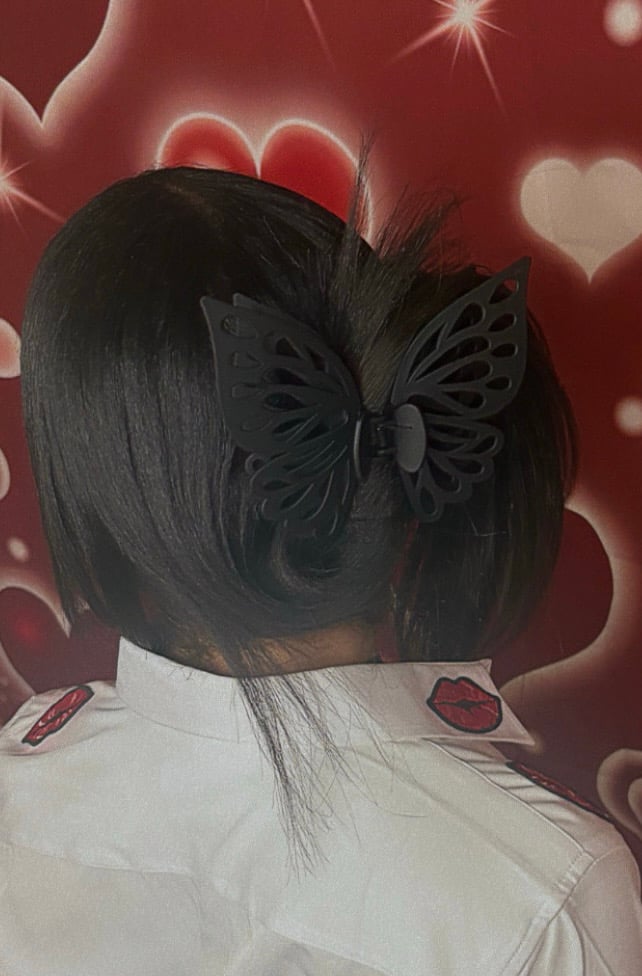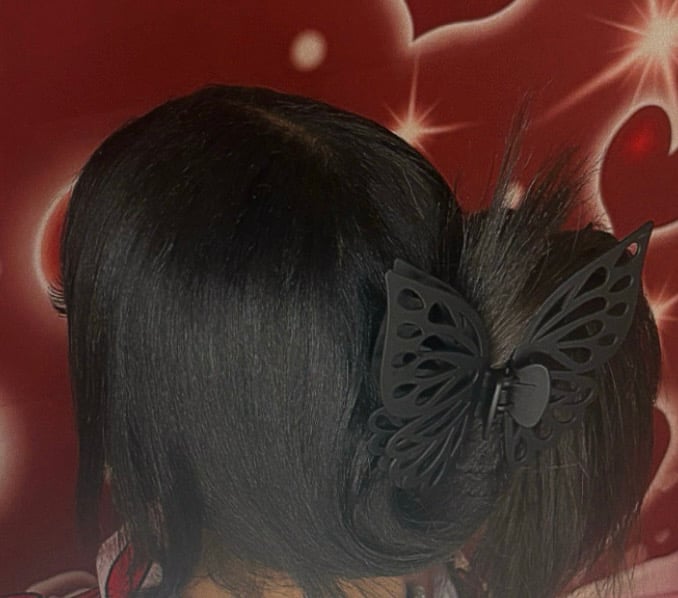 A decorative hair accessory, often made from metal alloy, a large black butterfly design claw clip. You can secure your hair with this claw or use it for a special event