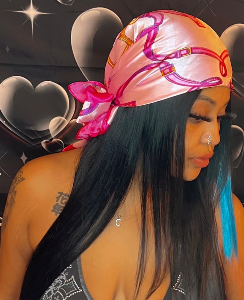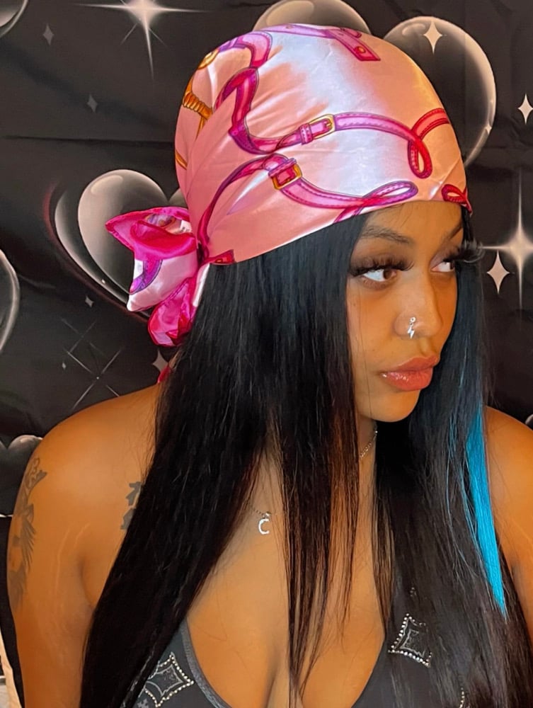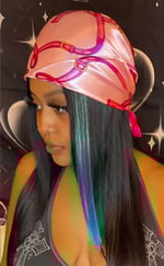A pink on hot pink design silk head scarf that is luxurious, & a versatile accessory known for its soft, smooth texture, natural sheen, and breathability. It protects hair from frizz, tangles, and breakage while adding style or getting a style done
