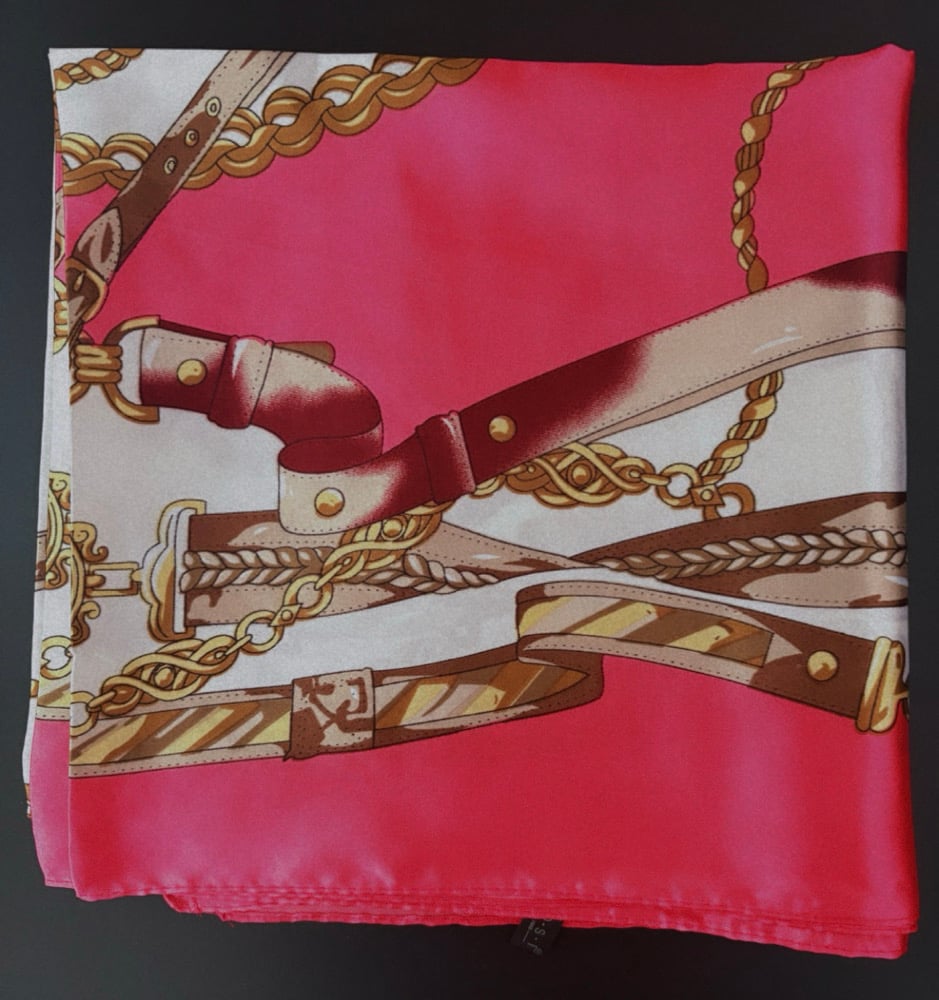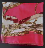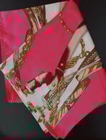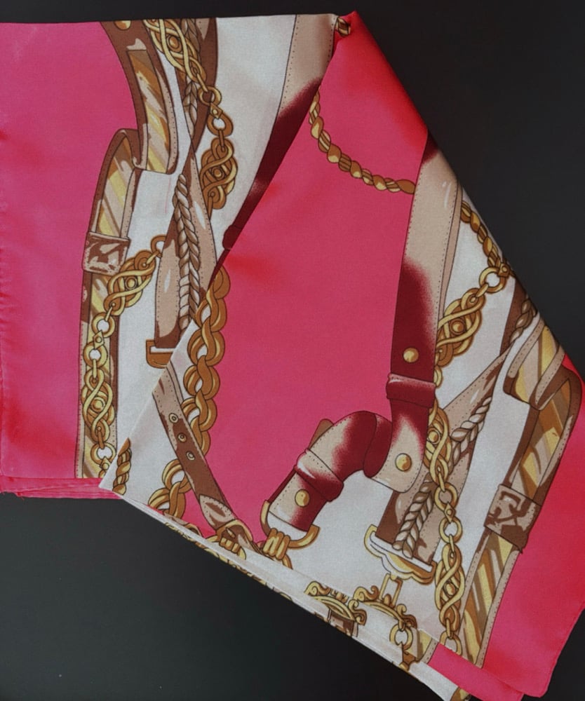 A pink & brown design silk head scarf that is luxurious, & a versatile accessory known for its soft, smooth texture, natural sheen, and breathability. It protects hair from frizz, tangles, and breakage while adding styles or getting styles done
