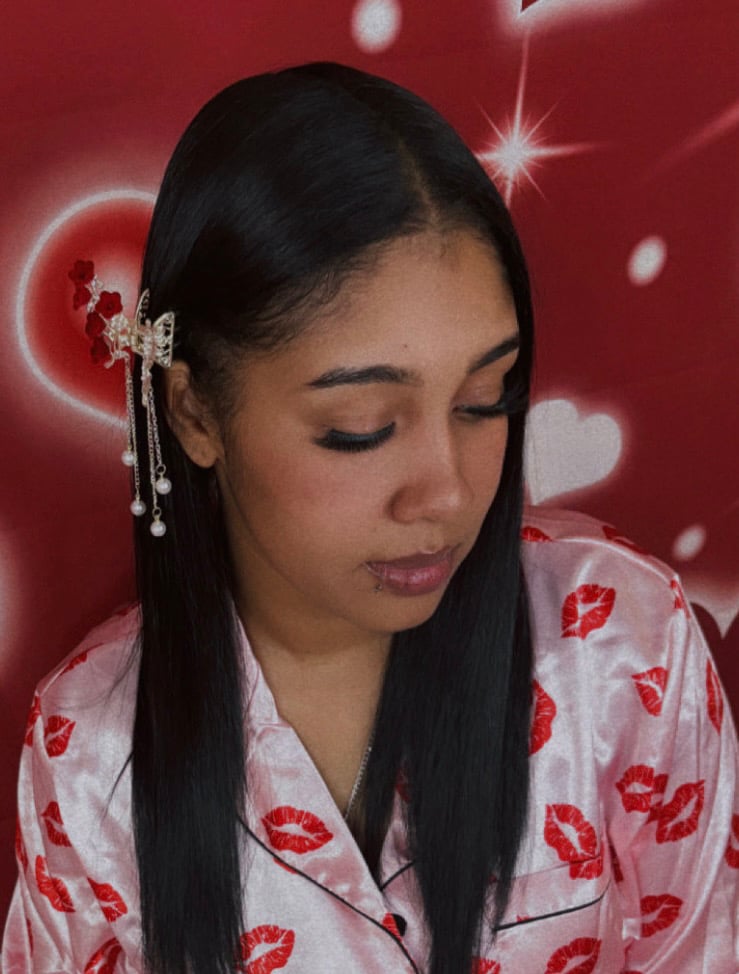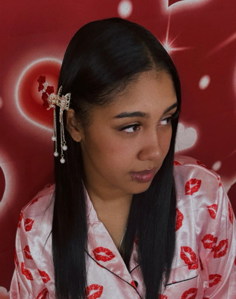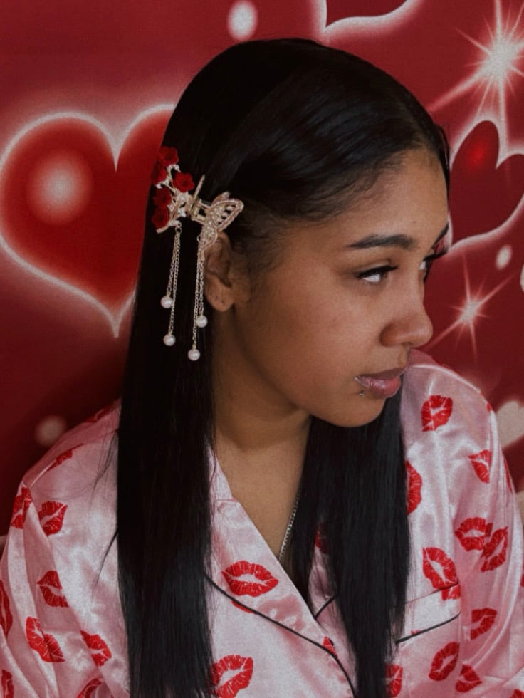 A decorative hair accessory, often made from metal alloy, a butterfly design claw clip with red flowers & design thats delicate. You can secure your hair with this claw or use it for a special event